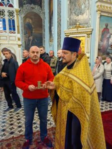 Ему сослужили почётный настоятель собора протоиерей Сергий Догадин, ключарь собора протоиерей Димитрий Усольцев, благочинный собора иерей Роман Поршнёв, иерей Сергий Нурматов и диакон Иоанн Горбач.
