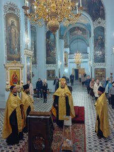 Ему сослужили ключарь собора протоиерей Димитрий Усольцев, благочинный собора иерей Роман Поршнёв, иерей Сергий Нурматов и диакон Иоанн Горбач.