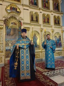 Ему сослужили почетный настоятель собора протоиерей Сергий Догадин, ключарь собора протоиерей Димитрий Усольцев, благочинный собора иерей Роман Поршнёв, иерей Сергий Нурматов и диакон Иоанн Горбач.