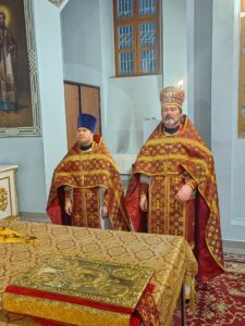 Ему сослужили почетный настоятель собора протоиерей Сергий Догадин, ключарь собора протоиерей Димитрий Усольцев, благочинный собора иерей Роман Поршнев, клирик собора иерей Сергий Нурматов и диакон Иоанн Горбач.