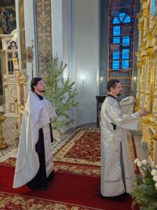 Ему сослужили ключарь собора протоиерей Димитрий Усольцев, благочинный собора иерей Роман Поршнев, клирик собора иерей Сергий Нурматов и диакон Иоанн Горбач.