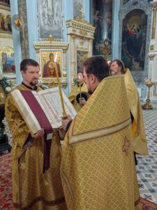 Всенощное бдение совершил настоятель собора иерей Александр Чеботарев. Ему сослужили почетный настоятель протоиерей Сергий Догадин, ключарь собора протоиерей Димитрий Усольцев, благочинный собора иерей Роман Поршнев, клирик собора иерей Сергий Нурматов и диакон Иоанн Горбач.